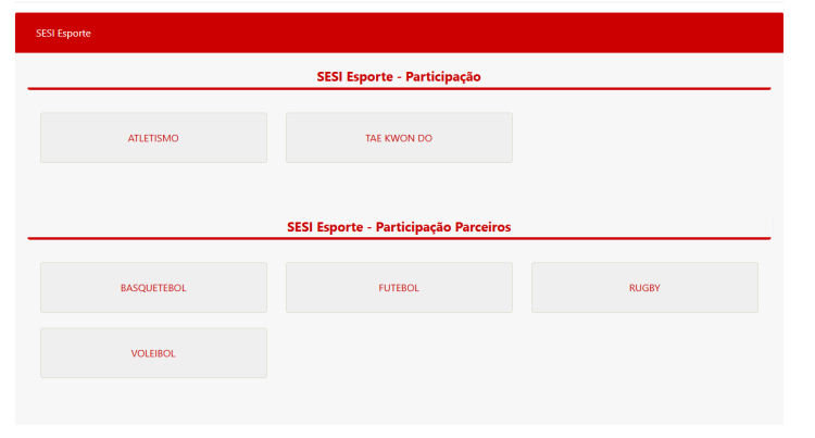Na aba SESI Esporte – Participação Parceiros, estão disponíveis basquetebol, futebol, rugby e voleibol.